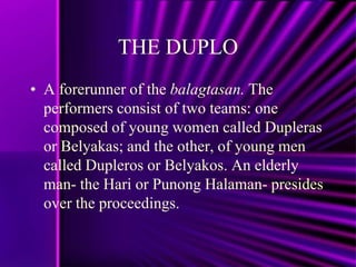 The Duplo A forerunner of the balagtasan. The performances consist of two teams. And the other of young men called Dupleros or Belyakos.
