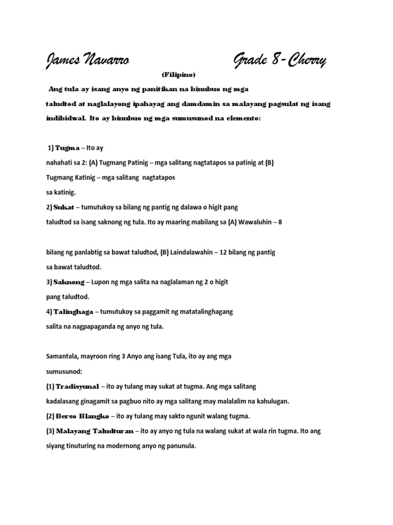 Inilalarawan dito ang takbo ng buhay ng mga Pilipino gayundin kung paano nila sinusunod ang ilang paniniwala tradisyon pananampalataya at higit sa lahat ang paglinang ng kagandahang asal. Inilalahad ang sining na ito na isang uri ng panitikan na kung saan ipinapahayag ang mga saloobin o pangangatwiran sa pamamagitan ng pananalitang may mga tugmaan. Tulang Pasalaysay narrative poetry Isang tula na may balangkas.