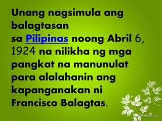Hinango mula sa pangalan ni Francisco Balagtas. Simula noon naging tanggap na ng mamamayang Pilipino ang Balagtasan bilang isang karaniwang libangan Nagsimula itong itanghal sa mga bulwagan hanggang sa mapakinggan sa radyo. Ang mga makatang ditoy napipisan sa ngalang pagtulay inaanyayahan.