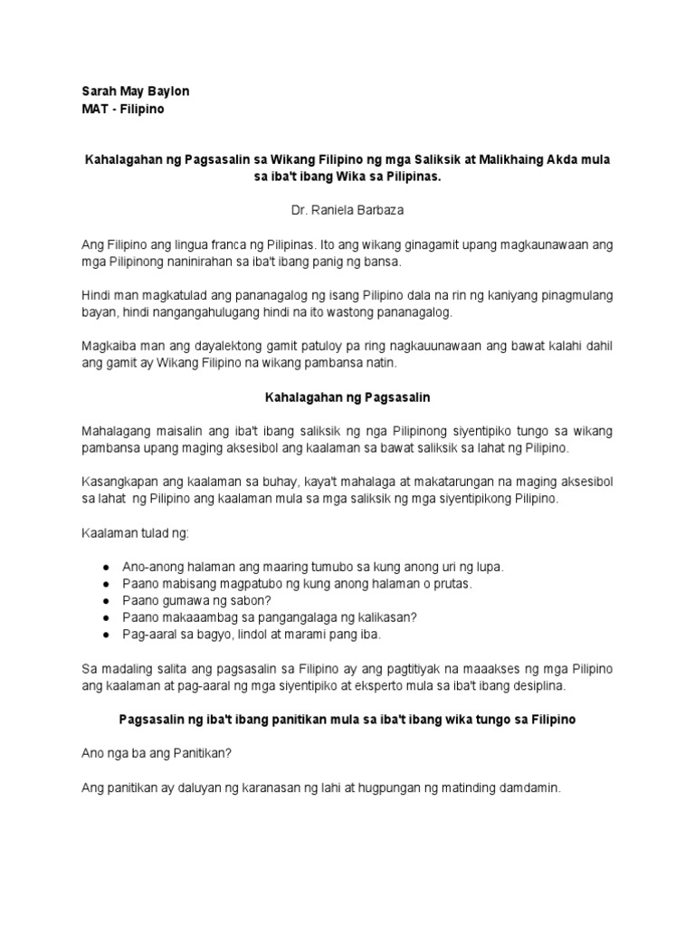 Kahalagahan Ng Pagsasalin Sa Wikang Filipino Ng Mga Saliksik At Malikhaing Akda Mula Sa Iba T Ibang Wika Sa Pilipinas Pdf