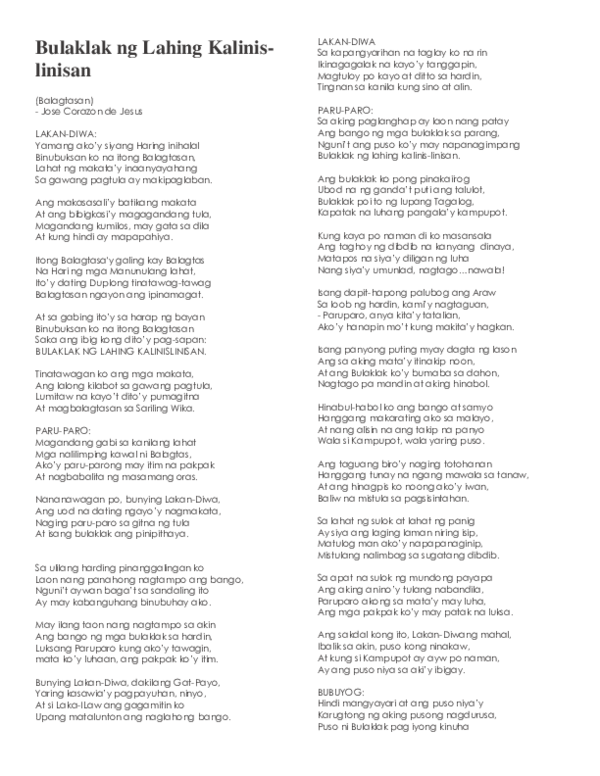 Balagtasan - Jose Corazon de Jesus PARU-PARO. LAKANDIWAang tagapagpadaloy ng Balagtasan PARUPARO at BUBUYOGang nagdedebate KAMPUPOT6 o BULAKLAKang pinag-aagawan 2. Ang makasasaliy batikang makata At ang bibigkasiy magagandang tula Magandang kumilos may gata sa dila At kung hindi ay mapapahiya.