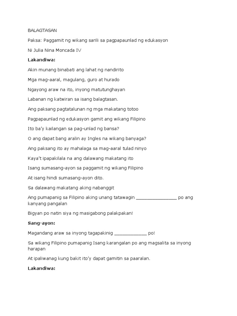 Ay kung anong wika ba ang magiging wikang panlahat. Isang Balagtasan ni Gng. Minamahal naming mga kamag-aral Mga magulang mga guro at prinsipal Mga panauhing pinagpipitaganan Na naririto ngayon sating paaralan.