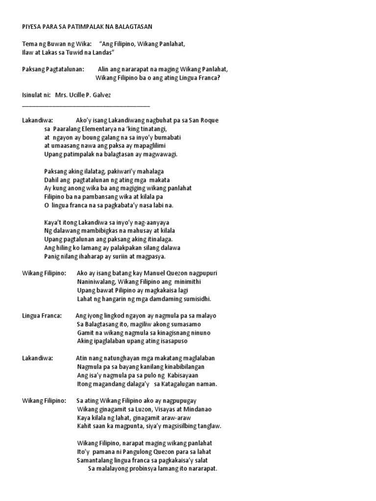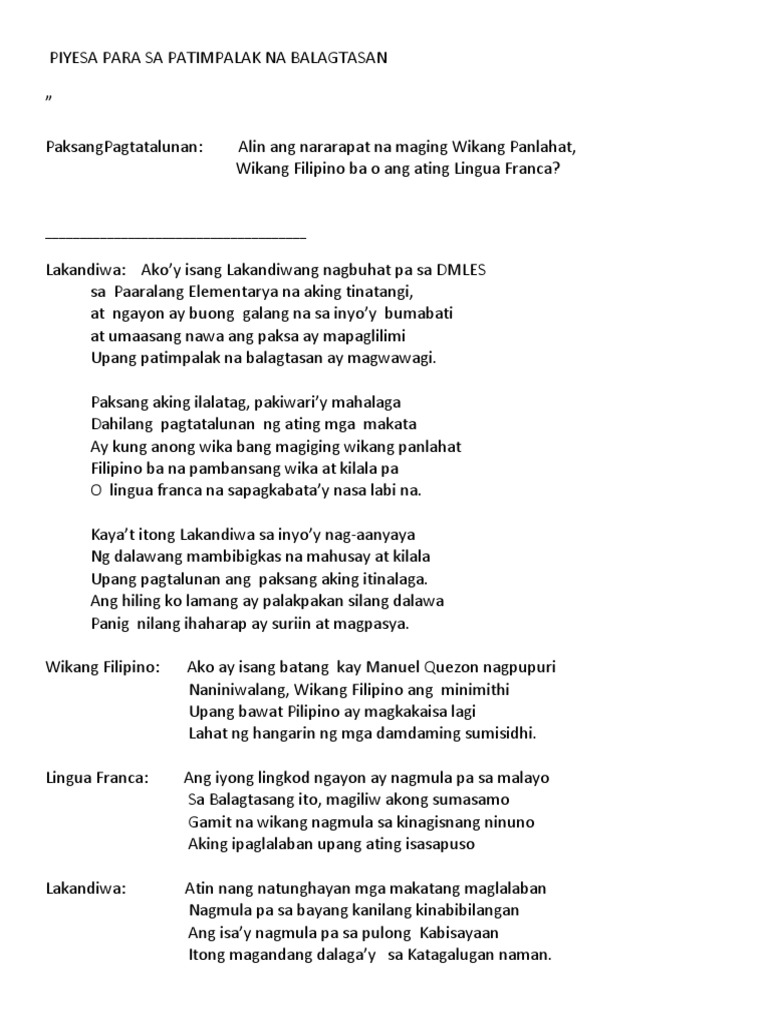 Ay kung anong wika ba ang magiging wikang panlahat. Isang Balagtasan ni Gng. Paksang aking ilalatag pakiwariy mahalaga Dahil pagtatalunan ng ating mga makata Kung.