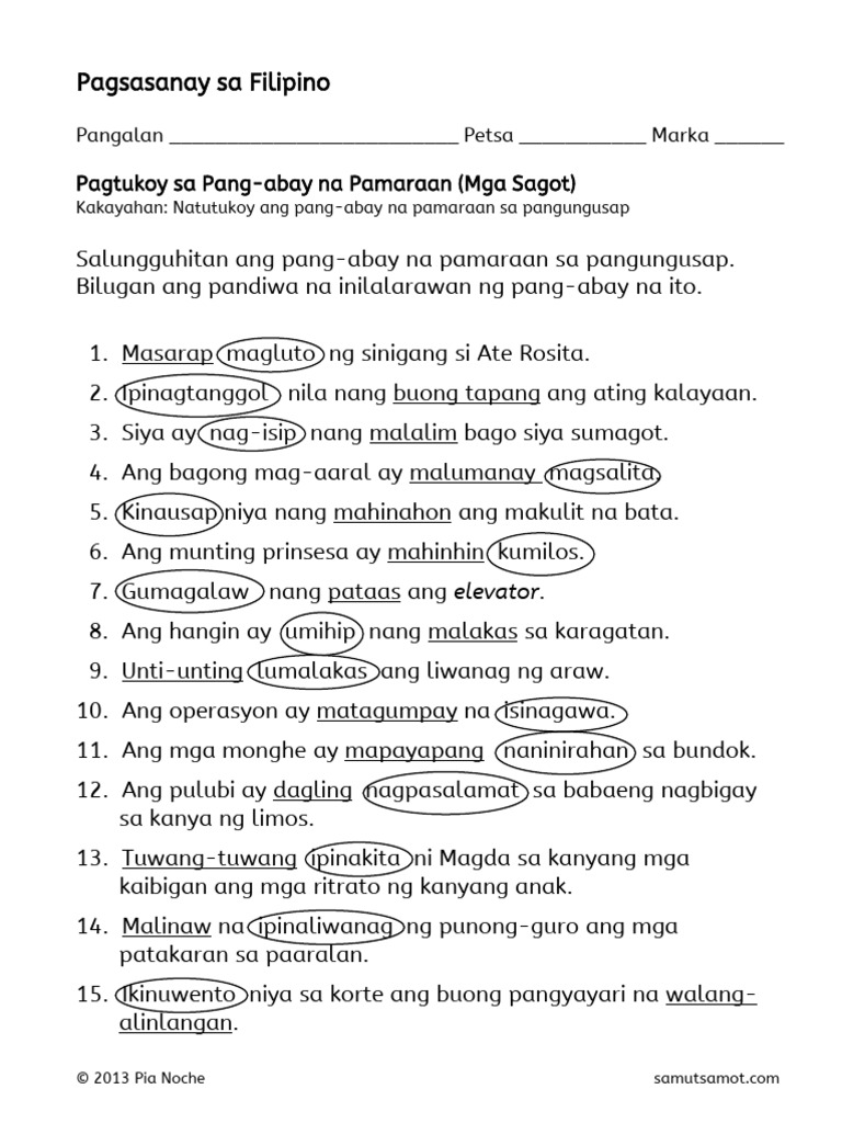 Ito ay may ibat. This 20-item worksheet asks the student to identify whether the underlined adverb or adverb phrase is an adverb of manner pang-abay na pamaraan adverb of place pang-abay na panlunan or adverb of time pang-abay na pamanahon. NAT PRE-TEST NO2 FILIPINO by SKDLC_IntermediateGS.