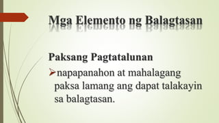 - tauhan - pinagkaugalian - paksaIsyung pagtatalunan - mensahemahalagang A. Mula sa Balagtasan Book One na tinipon at isinaayos ni CS. MGA ELEMENTO NG BALAGTASAN 1Tauhan aLakandiwa-siya ang tagapakilala ng paksa ng paglalabanan sa tulaan ng dalawang mambabalagtasSiya rin ang tagapamagitan o taga pagbigay hatol ayon sa katwirang inilahad tungkol sa paksatikastinig at kakayahang umakit sa mga nakikinig.