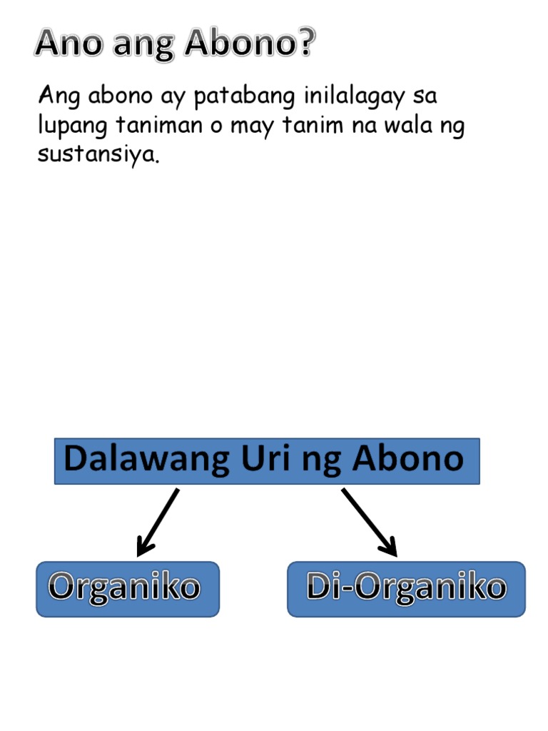 Learn vocabulary terms and more with flashcards games and other study tools. Sa paraang ito ang abono ay isinasabog lamang sa tanim. Sa aming probinsya ang madalas na gamiting abono o pampataba ay ang dumi ng kalabaw.