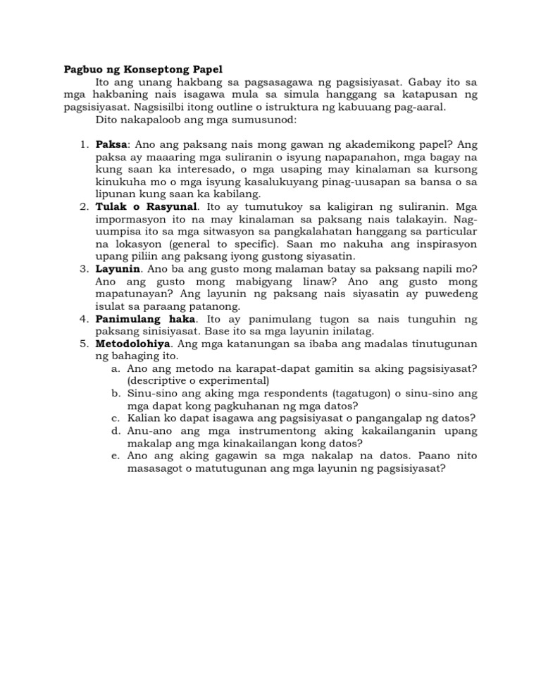 Nabibigyang kahulugan ang mga konseptong kaugnay ng pananalikisk F11PT-IVcd-89 Naiisa-isa ang mga hakbang sa pagbuo ng konseptong papel. Tulad ng sa ibat-ibang uri ng papel na isisinusulat mapa-essay man o maikling kwento nakasanayan na naming bigyang halaga sa mga PaanoHow articles namin ang simula. Ang rationale layunin metodolohiya at inaasahang output o resulta.