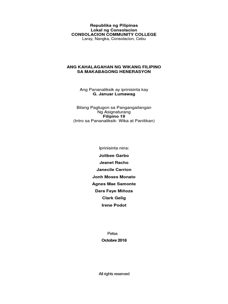 Pananaliksik sa wikang filipino halimbawa. Anita Boral Bilang Pagtupad sa isa sa mga Pangangailangan Ng Asignaturang Filipino2 Pagbasa at. Itinatadhana ng kurikulum sa Filipino mula sa Kagawaran ng Edukasyon para sa ibat ibang kurso at larangang pang-akademiko ang pagkakaroon ng mga komponent ng pananaliksik o riserts upang lubusang malinang ang kasanayan ng mga mag. Sa huli ay may 1828 pamantayang marka na lumawak ang wikang Filipino sa panahon ngayon.