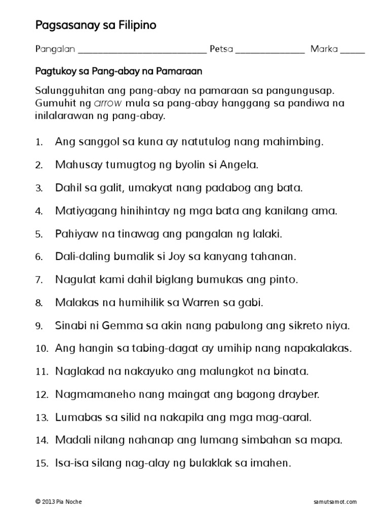 Siya ay umalis na umiiyak. Pang-abay na Panlunan Other contents. Each 15-item worksheet asks the student to underline the pang-abay in the sentence and draw an arrow from the pang-abay to the pandiwa verb that it describes.