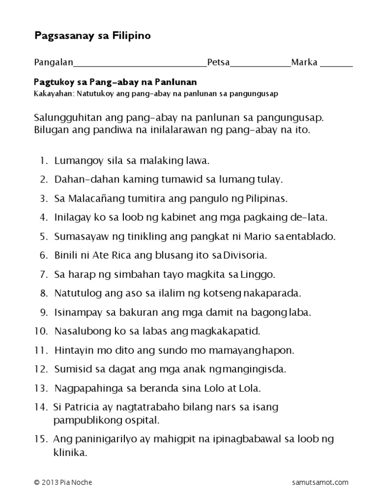 2012-11-28 The four free pdf worksheets below are about Filipino adverbs pang-abay. Kung alin bang pang-abay ang pamanahon panlunan at pamaraan. Pang abay na pamaraan worksheet grade 2.