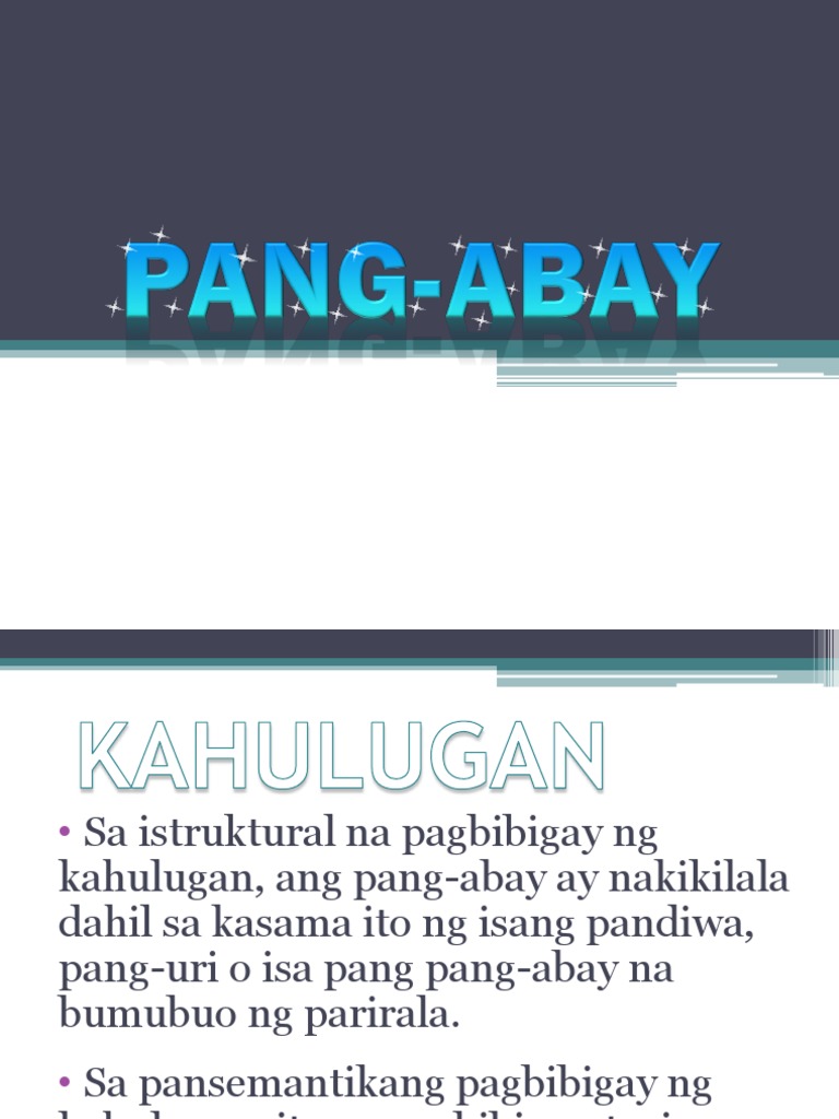 Tumutukoy din ito sa pook na pinangyarihan o pangyayarihan ng kilos sa pandiwa. Pang-abay Na Panlunan This type of adverb deals with the location or pook where something is happening or has happened. Pang-abay - ang tawag sa salita o lipon ng mga salitang nagbibigay-turing sa pandiwa pang-uri o kapwa pang-abay.