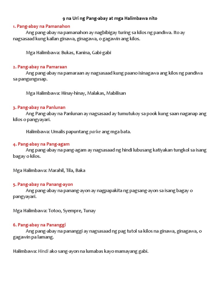 The types of pang-abay that are included in this post are pang-abay na pamaraan adverb of manner pang-abay na pamanahon adverb of time and pang-abay na panlunan adverb of place. Heto ang mga halimbawa. Pang-uri halimbawa Narito ang mga.
