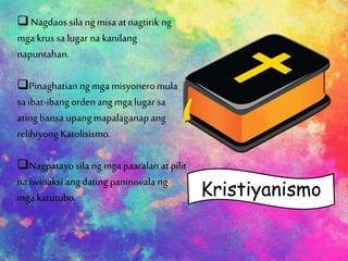 Paraan ng Pananakop ng Mga Espanyol sa Pilipinas Ang Kristiyanismo at Ang Reduccion created by Rose Tabije on 13112019. Ipinakilala nila sa mga katutubo ang ibat ibang katuruan ng Kristiyanismo. 15Isa sa mga programa sa panunungkulan ni Pangulong Diosdado P.