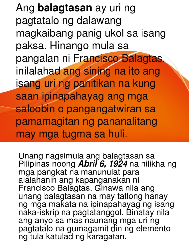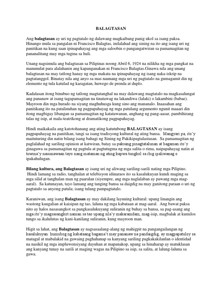 Derived from the name of Francisco Balagtas this art presents a type of literature in which thoughts or reasoning are expressed through speech. Noong araw sa bayan ng Sariwa naninirahan ang lahat ng uri. Ang balagtasan ay naging paboritong aliwan ng mga Tagalog.