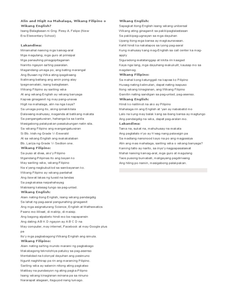 Wikang Filipino o Wikang English. Jul 08 2021 balagtasan wikang filipino o wikang english docx group 7. Felipe New Era Elementary School Lakandiwa.