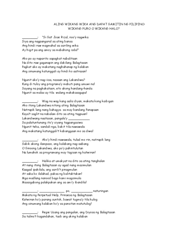 Pagkat nasasangkot ditoy bayan nating sinisinta. Balagtasan is a Filipino form of debate done in verseDerived from the name of Francisco Balagtas this art presents a type of literature in which thoughts or reasoning are expressed through speech. Kasipagan at talino pagsamahing walang toos Kayat dapat ng magsanib pag-isahing lubos-lubos.