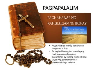 Panalangin Ito ay paraan ng pakikipag-ugnayan ng tao sa Diyos. Ito ay biyayang galing sa Diyos upang ipaabot ng tao ang kanyang iniisip nadarama nakikita at nararanasan sa kanyang kapwa tao. Sa pananampalataya naniniwala at umaasa ang tao sa mga bagay na hindi nakikita.