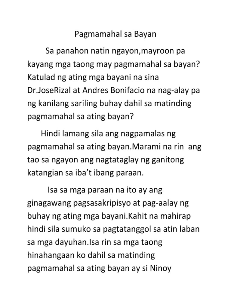 Gamitin ang sariling wika. Ang pagmamahal sa ating bayan ay ang pagmamahal sa mga tao at mga likas na yaman na sinasakop nito. Ang pagmamahal sa inang bayan ay nasusukat.