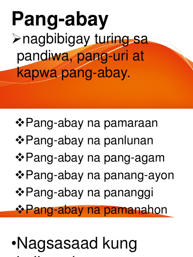 Examples of pang-abay na pang-agam are listed below. Mahusay tumugtog ng gitara ang mama. Pang-abay in English Translation Meaning of Pang-abay in English.