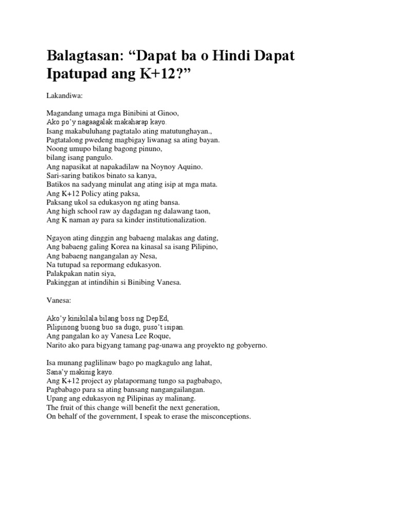 Balagtasan tagalog halimbawa ng maikling balagtasan. Alin and Higit na Mahalaga Wikang Filipino o Wikang English. Examples of short poetic tagalog. Ako po ang inyong punong lakandiwa Magpapakilala ng dalawang manunula Isang magsasabing yaman ang mas sasagana At isang nagsasabing talino ang mas mahalaga Ano nga ba ang totoo mga binubinit ginoo Anong mas mahalaga Yaman ba o talino Kanilang pagtatalunan ang paksang binanggit ko Masigabog palakpakan.
