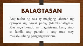 Or the decision may be left to the audience. MGA KAHULUGAN SA TAGALOG Ang lakandiwa ay tagapamagitan at tagahatol ng dalawang nagbabalagtasan. Sa balagtasan ay may tinatawag na hukom.