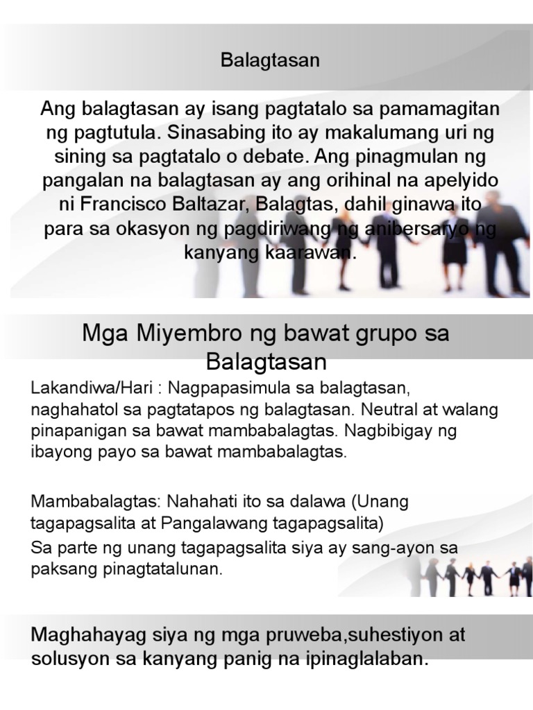 Dalawang tao nagtatalo sa isang paksa. A judge known as the lakandiwa if male or lakambini if female will decide the winner of the balagtasan. Ito ay maaaring isinulat ng mga mag-aaral o ng mga mag-aaral na may kaunting.